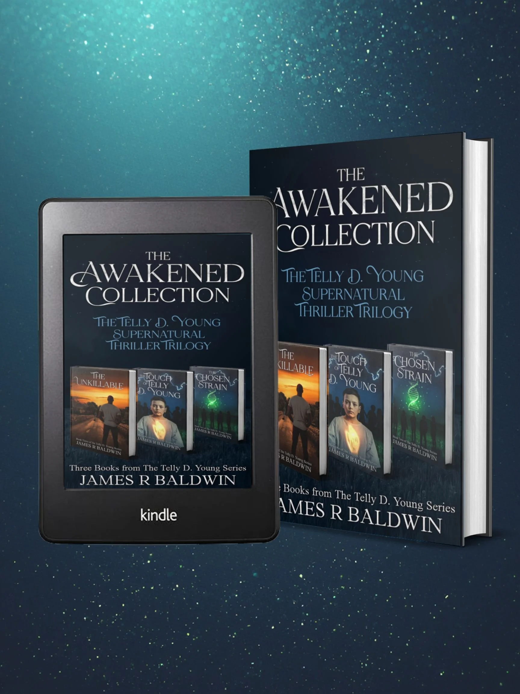 The Awakened Collection Christian Fiction bookbrings together the First three gripping science Fiction mystery thriller suspense novels,The Touch of Telly D. Young, The Unkillable, and The Chosen Strain, in a sweeping saga of faith, sacrifice, and impossible choices, where every act of healing blurs the line between miracle and curse, and one haunting question rises above them all: